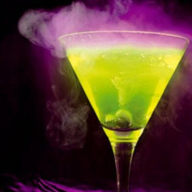 Sour Melon liqueur, lemon and lime juice, simple syrup, and vodka, and a little dry ice to leave it smoking. Sour with just a bit of sweet to soothe, this drink may seem intimidating at first, but the mysterious glow and balance of flavors will bring you back again and again. Because who doesn't love a good mystery?