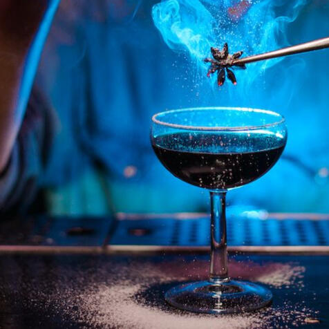 Molasses, high proof rum, and blue Curaçao, dusted with powder sugar and set aflame. Sweet and citrus mingle together in this heady drink. Like love at first sight, it's sweet but might knock you off your feet. Best be sure of your balance.